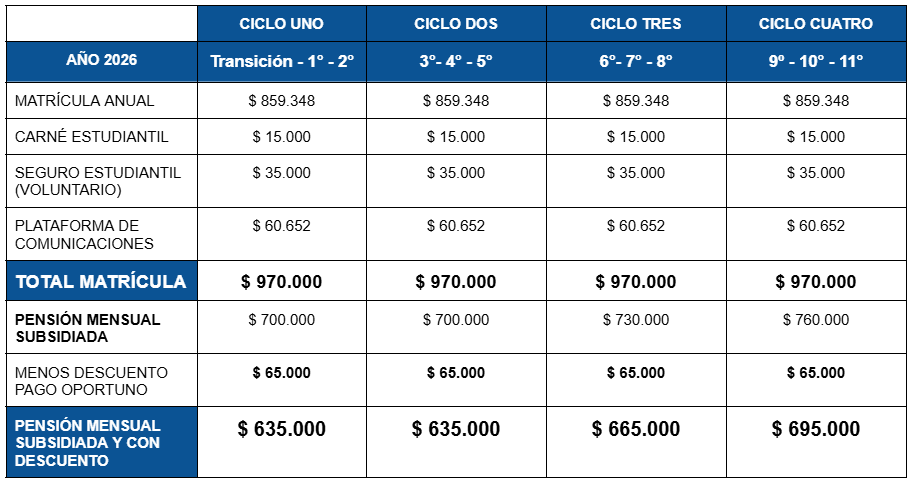 Es la suma anual que se cobra al estudiante por el derecho a participar en el proceso formativo, durante el respectivo año académico. Cada padre de familia tiene obligación, por contrato, de pagar la pensión del estudiante dentro de los cinco primeros días de cada mes. La morosidad en los pagos genera un interés mensual equivalente al máximo permitido por la ley. Los pagos se harán únicamente por PSE. No se recibe efectivo.
