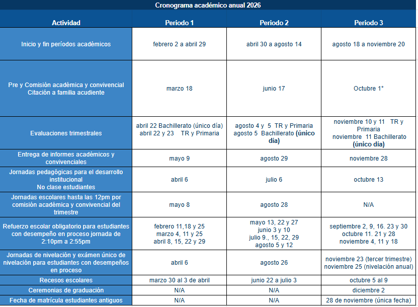 El horario de clases funciona de manera rotativa por días del 1 al 6, lo que significa que, en caso de presentarse un día festivo, las clases no se pierden, sino que continúan con el orden establecido.