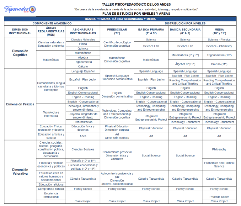 De acuerdo con la Ley 115 de 1994, el plan de estudios organiza de manera secuencial las áreas del conocimiento, garantizando un aprendizaje progresivo, el respeto por la diversidad y la atención a los distintos ritmos de aprendizaje, en coherencia con el PEI institucional. El modelo pedagógico de Tapsandes se basa en el aprendizaje significativo (Ausubel) y en el desarrollo integral del ser humano (Merani – De Zubiría), estructurado en tres dimensiones: